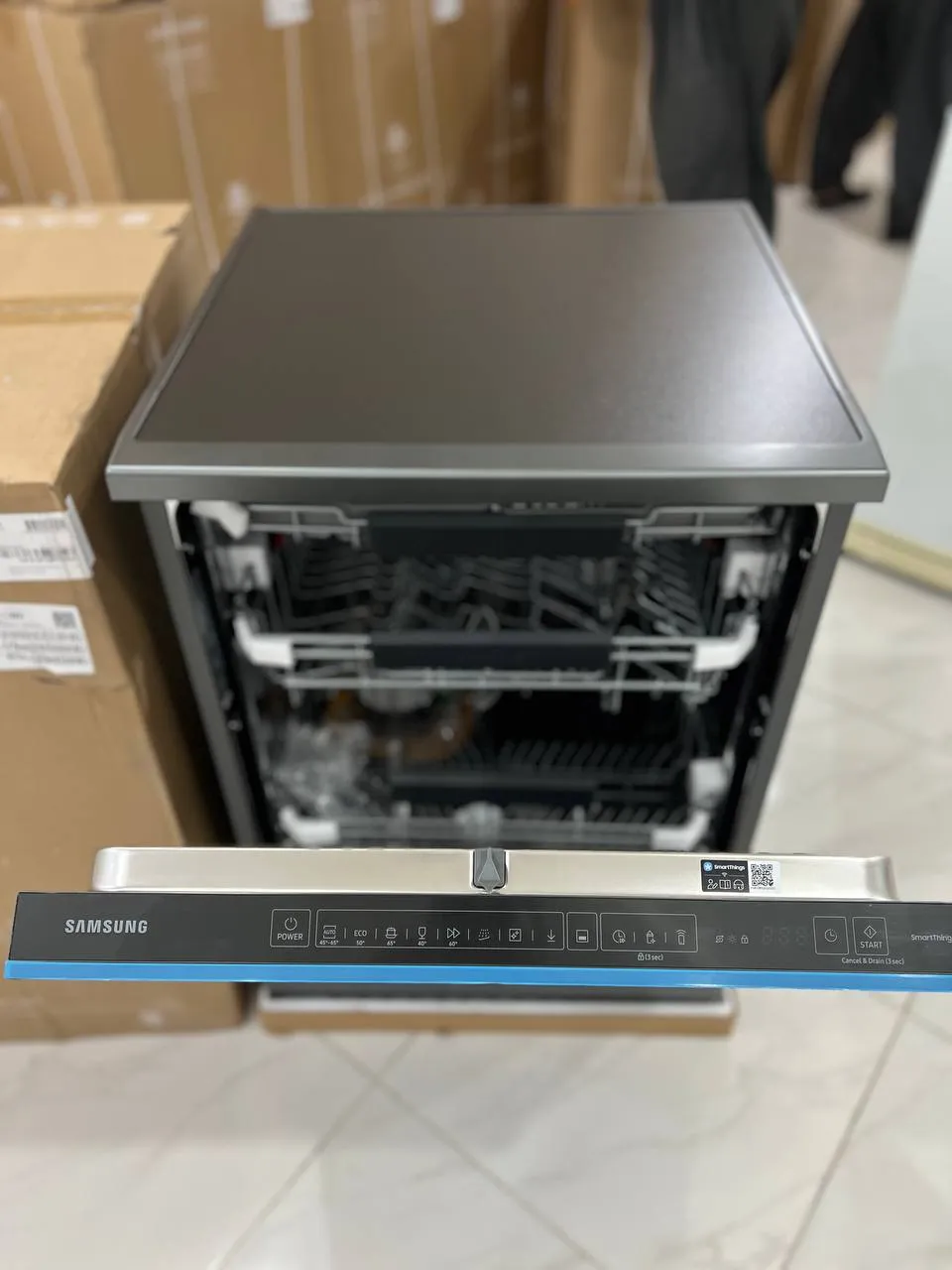 ماشین ظرفشویی سامسونگ مدل DW60A8050FG از فناوری هوشمند SmartThings پشتیبانی میکند و این یعنی شما میتوانید از طریق گوشی موبایل خود به دستگاه متصل شوید، وضعیت فعلی شست و شو را ببینید، یا حتی برنامهی مورد نظرتان را از راه دور اجرا کنید. اپلیکیشن SmartThings علاوه بر کنترل از راه دور، پیشنهادهایی برای انتخاب بهترین برنامهی شست و شو بر اساس نوع ظروف و سطح آلودگی ارائه میدهد. همچنین در صورت بروز خطا یا نیاز به تمیز کردن فیلتر، اعلان هایی برای کاربر ارسال میکند تا همیشه از وضعیت سلامت دستگاه باخبر باشید. این قابلیت باعث میشود کار با ظرفشویی بسیار هوشمند تر، راحت تر و بروز تر از مدل های معمولی باشد.