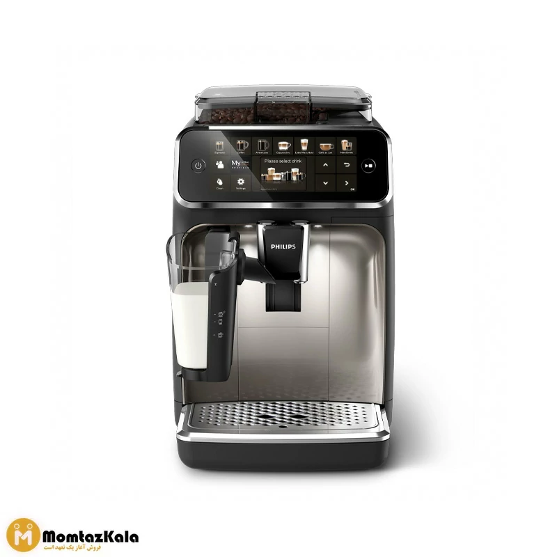 اسپرسو ساز فیلیپس EP5447 یه دستگاه کاملاً خودکارِ که با طراحی مدرن و امکانات بالا اومده تا قهوه دوست ها رو راضی کنه. با این دستگاه شما میتونید از دانهٔ قهوه تازه استفاده کنی، تنظیمات طعم و حجم قهوه رو به راحتی تغییر بدی و با سیستم LatteGo شیر رو به کفِ فوق العادهای تبدیل کنی بدون دردسر. همچنین فیلتری به اسم Aqua Clean داره که تا حدود زیادی از رسوب گرفتن دستگاه جلوگیری میکنه و نیاز به رسوب زدایی مداوم رو کاهش میده.
