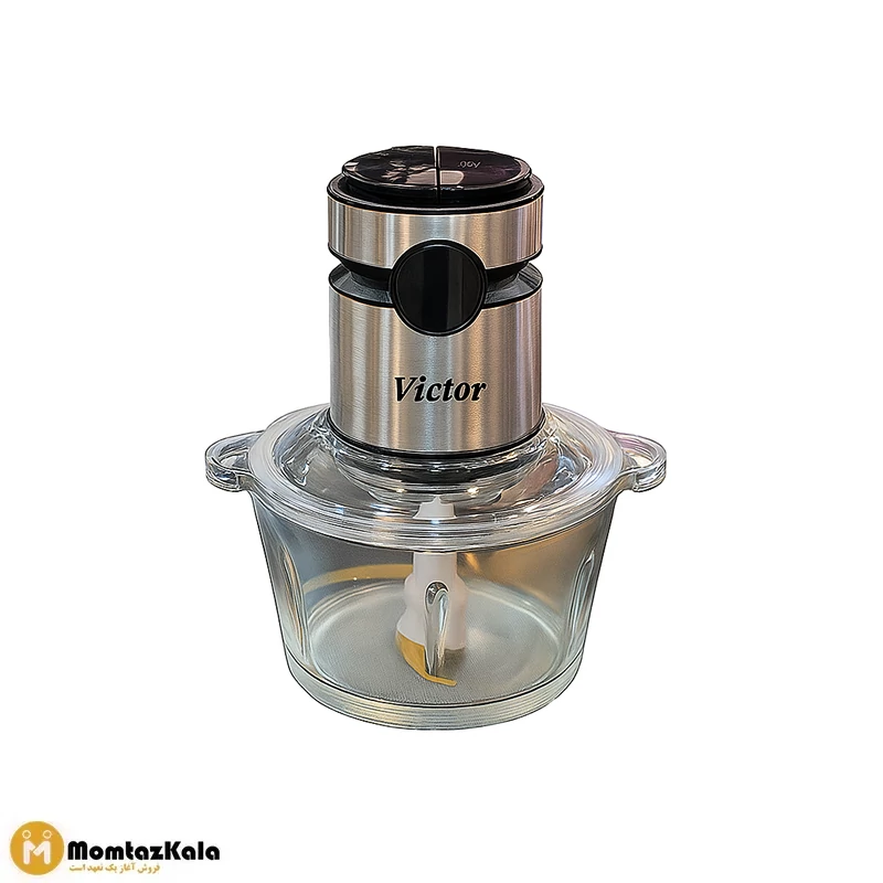 مدل Victor VK1001CH یا همون VK-1001 که توی بازار ایران میبینیم، یه خردکن خوش قدرت و جمع و جوره که ظاهر مدرن و جذابی هم داره. قسمت بالایی دستگاه که موتور توش قرار گرفته، با روکش نقرهای یا خاکستری براق طراحی شده و حس استحکام و کیفیت رو منتقل میکنه. طراحی عمودی و استوانه ای این بخش باعث میشه دستگاه خیلی کم جا باشه و راحت توی آشپزخونه قرار بگیره.