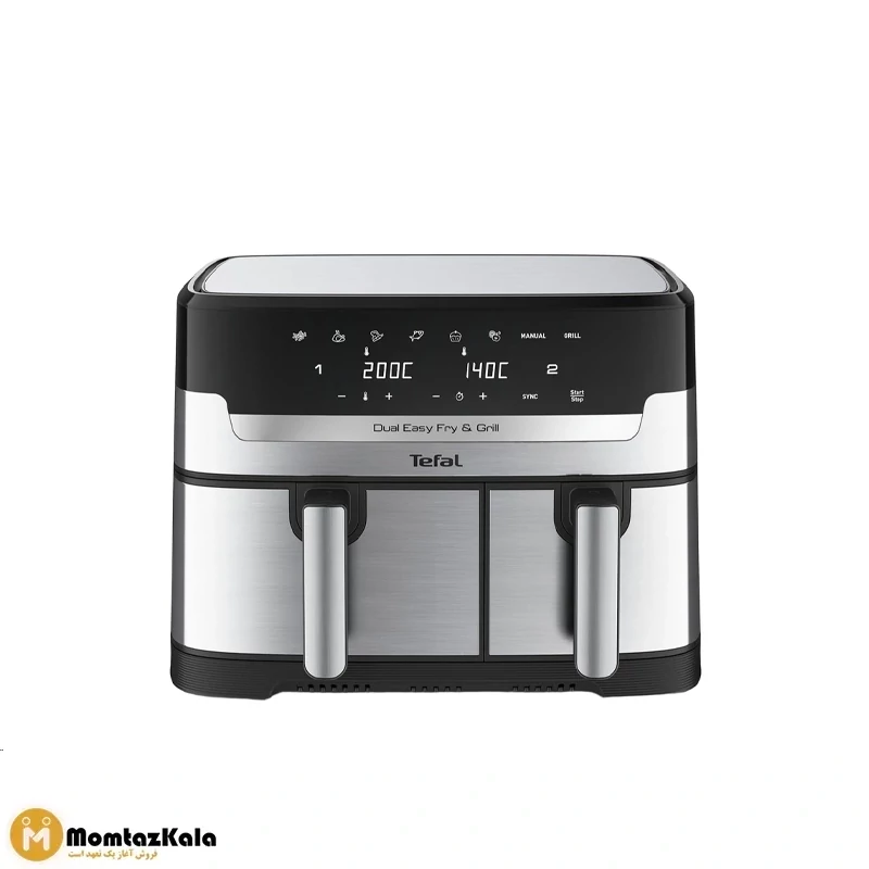 سرخ کن بدون روغن تفال مدل EY905 یه دستگاه همه فن حریفه که هم میتونه به جای یه سرخ کن حرفهای کار کنه و هم به عنوان گریل استفاده بشه. این مدل به خاطر داشتن دو کشو جدا از هم، یه انتخاب فوق العاده برای خانوادههای پرجمعیت و کساییه که همیشه دنبال تنوع غذایی هستن. مثلا میتونی تو یکی از کشوها مرغ یا استیک بذاری و همزمان تو کشوی دیگه سیب زمینی یا سبزیجات درست کنی و در نهایت هر دو غذا با هم حاضر بشن. همین موضوع باعث میشه زمان آشپزی خیلی کمتر بشه و همه اعضای خانواده بتونن با هم سر میز بشینن.