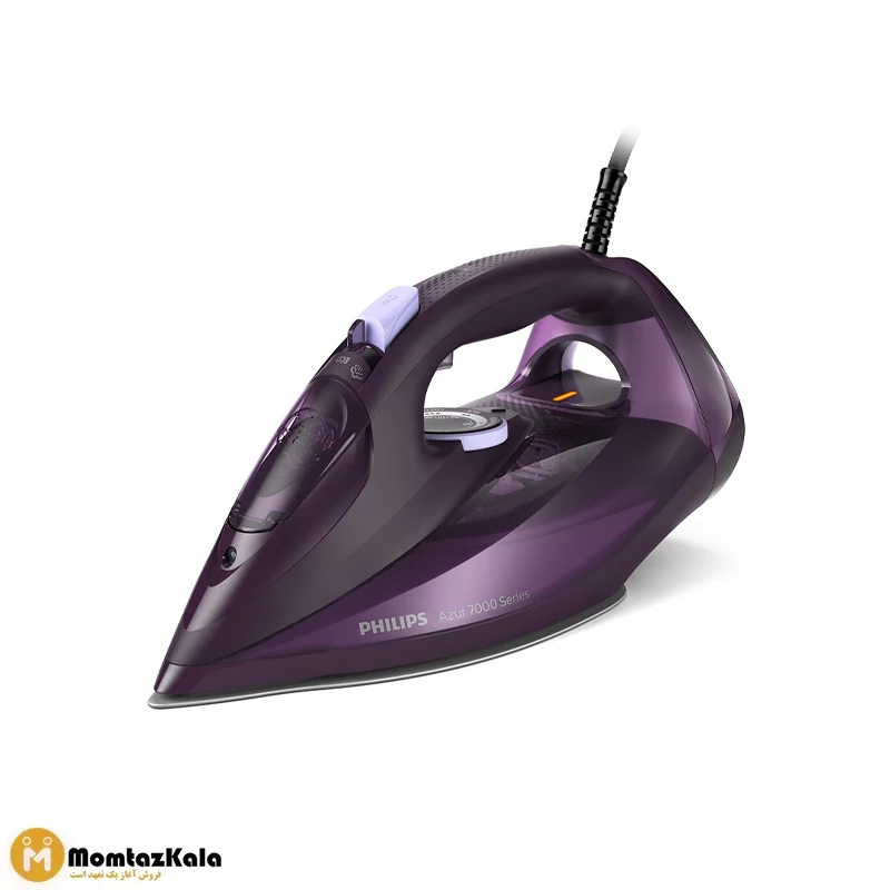 اولین چیزی که تو اتو بخار دستی فیلیپس DST7051 در نگاه اول تو رو جذب میکنه ظاهر شیک و رنگ جذاب این اتوه. بدنهی بنفش تیره با جزئیات براق، حس مدرن و پرلوکسی ایجاد میکنه که تو کابینت یا روی میز اتوکشی واقعاً به چشم میاد. بدنه از پلاستیک فشرده ساخته شده؛ ترکیبی از سبکی و استحکام که حمل و کار با دستگاه رو آسان میکنه. دستگیره ی اتو به صورت ارگونومیک طراحی شده و بافت دار هست تا حتی بعد از اتوکشی طولانی دچار لغزش یا خستگی نشی. این توجه به جزئیات در ظاهر دقیقاً همونی هست که استفاده راحت و احساس کنترل رو تضمین میکنه.