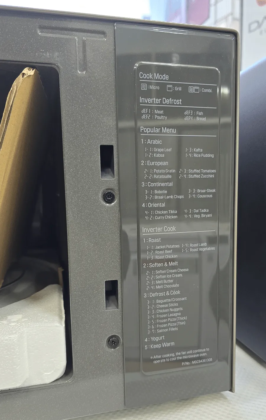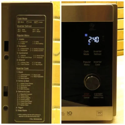 | برنامه های پخت و پز | برنامه Cooking/Defrost برای پخت و پز 8 نوع غذا, برنامه Inverter Defrost برای یخ زدایی 4 نوع مواد غذایی, برنامه Popular Menu برای پخت و پز 16 نوع غذا, برنامه Proof & Warm برای گرم کردن 2 نوع غذا, برنامه Roast برای پخت و پز 5 نوع غذا, برنامه Soften/Melt برای ذوب کردن 4 نوع مواد غذایی |