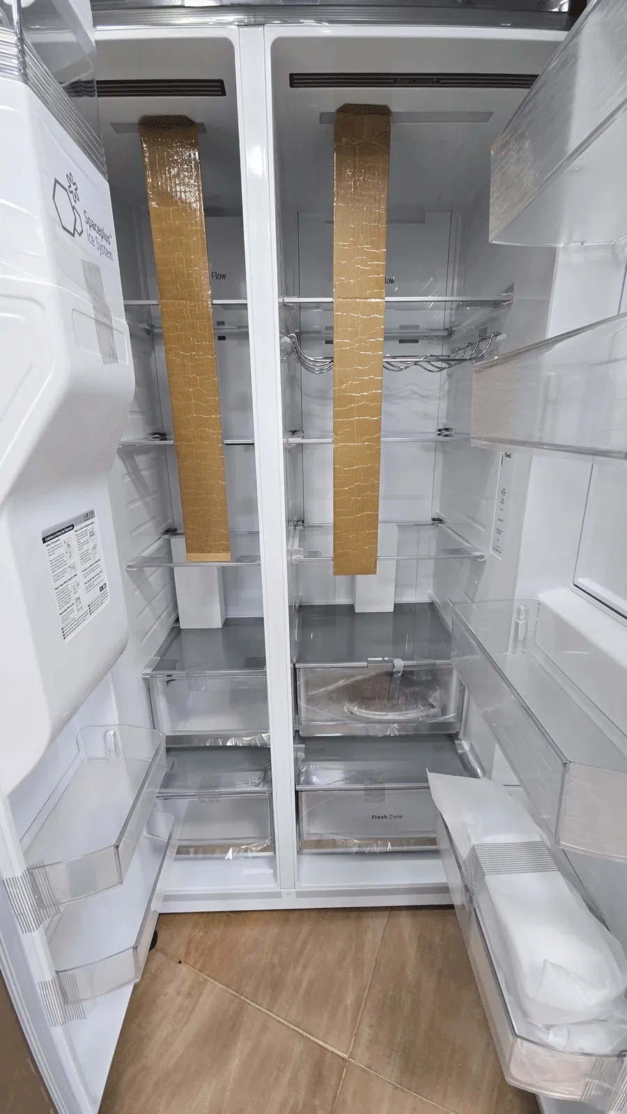 در داخل یخچال، 4 طبقه شیشهای با مقاومت عالی قرار دارن که میتونید به راحتی تمیزشون کنید. دو کشوی بزرگ هم برای میوه و سبزیجات دارین که رطوبت رو تنظیم میکنن تا همیشه تازه بمونن. در بخش فریزر هم 4 طبقه مقاوم وجود داره که فضایی کافی برای نگهداری مواد منجمد مثل گوشت و مرغ میده. کشوهای بزرگ Freezing Zone هم برای فریز کردن انواع مواد غذایی در پایین قرار دارن. درب فریزر هم دو طبقه داره که قسمت یخ ساز اتوماتیک توش قرار گرفته. متاسفانه این کشوها و طبقات قابلیت جابجایی ندارن ولی میتونید به راحتی اونها رو از دستگاه بیرون بیارید و تمیز کنید.