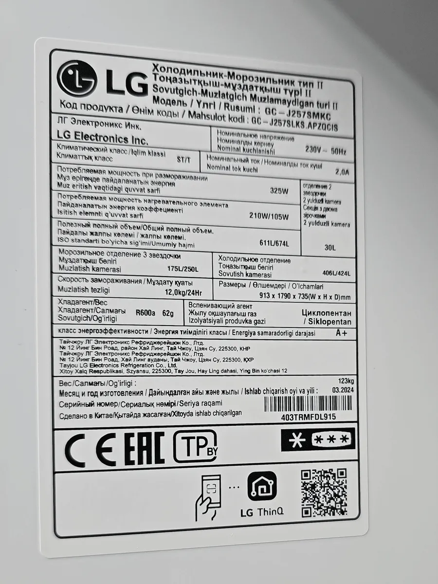 این مدل به اسم یخچال فریزر ال جی J257 سفید هم شناخته میشه و در بازارهای مختلف موجوده، پس باید دقت کنید که مدل درست و دقیق رو خریداری کنید. در ایران، این محصول مونتاژ چین هست و با رنگ سفید به بازار عرضه میشه، البته نسخه نقرهای اون با مدل GC-J257CAEC هم تولید شده. ظرفیت این یخچال فریزر 674 لیتره که معادل 24 فوت میشه، که در این ظرفیت، بخش یخچال 424 لیتر و بخش فریزر 250 لیتر رو شامل میشه. ظرفیت واقعی این یخچال هم 617 لیتره که معادل 22 فوت هست، که در این ظرفیت، بخش یخچال 412 لیتر و بخش فریزر 205 لیتره.