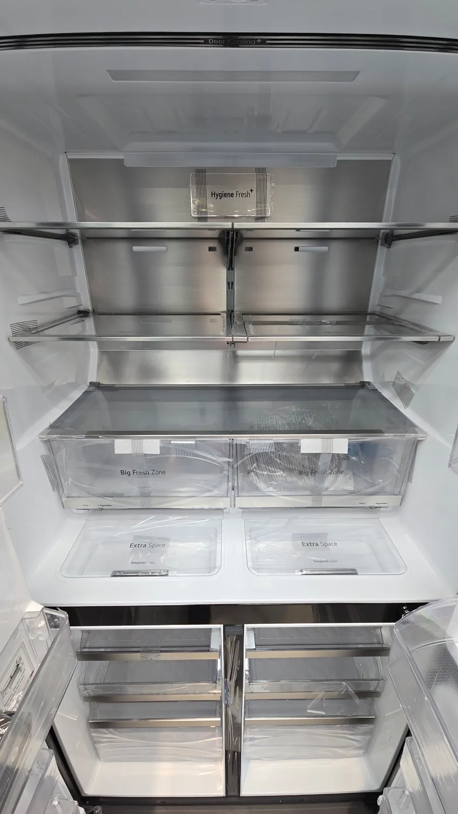 - تکنولوژی Door Cooling+: این فناوری هوای سرد رو از قسمت سقف یخچال به سمت دربها هدایت میکنه تا مواد غذایی روی درب و قفسهها هم بهخوبی سرد بشن.