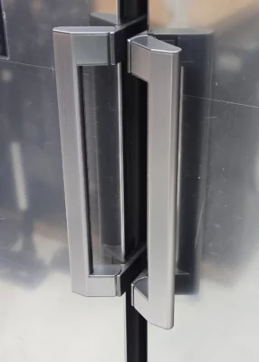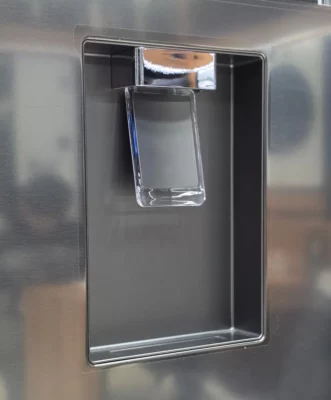 دستگیرههای یخچال دو قلو ال جی F511 و B514 نقره ای از نوع اهرمی هستند و به عنوان Easy Open Handle شناخته میشن که با زاویهای که هنگام باز شدن ایجاد میکنه، باعث میشه درب یخچال راحتتر باز بشه. روی درب یخچال یک پنل و آبریز قرار داره، ولی متاسفانه این مدل قابلیت اتصال مستقیم به آب شهری رو نداره و باید به صورت دستی مخزن آب رو پر کنید.