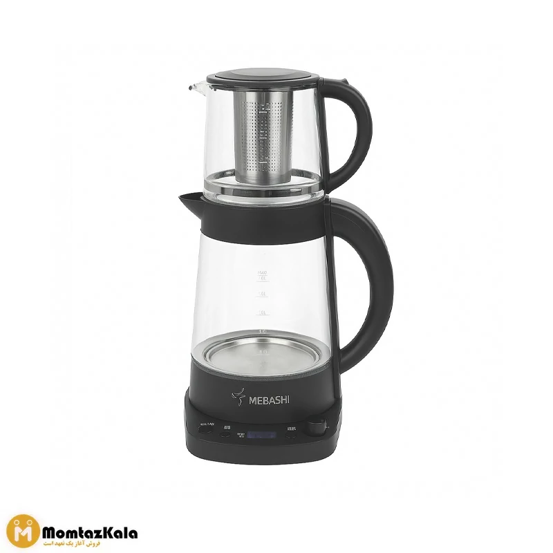 بالاش قوری شیشه ای خوش فرم با یه فیلتر استیل براق قرار گرفته که وقتی روی کتری شفافش میشینه، یه هارمونی قشنگی به دستگاه میده. انحناها و فرم نرم بدنه باعث شده ظاهرش خیلی چشم نواز باشه و لوگوی Mebashi روی پایه ش هم حس یه محصول لوکس رو منتقل کنه. خلاصه که 308 فقط یه چای ساز نیست، یه تیکه از دکور آشپزخونته.