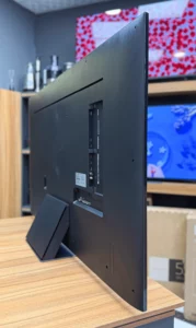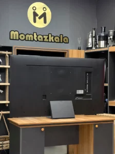اگه قصد نصبش رو دیوار رو داشته باشی، باید بدونی که ضخامتش خیلی کمه و طراحی پشتش کاملاً صاف و منظم انجام شده تا وقتی دیواری نصب میشه، یهدست و تمیز دیده بشه. ظاهر پشت تلویزیون هم شلوغ نیست و جای کابلها دقیق تعبیه شده که بتونی کابلها رو مرتب و مخفی جمع کنی.