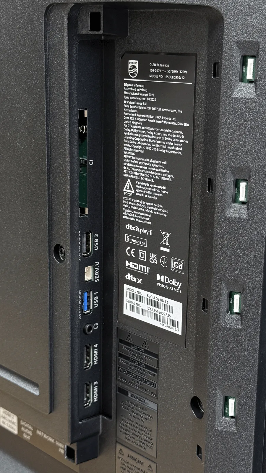 فیلیپس 65OLED910 در بخش درگاه ها نیز بسیار کامل است و با چهار پورت HDMI میتواند انواع دستگاه ها را پشتیبانی کند. دو پورت از نوع HDMI 2.1 هستند که برای کنسول های نسل جدید بهترین عملکرد را ارائه میدهند و امکان دریافت تصویر 4K@120Hz، VRR و ALLM را فراهم میکنند. دو پورت HDMI 2.0 نیز برای اتصال دستگاههای جانبی مانند پخشکنندهها، رسیور و سیستمهای صوتی مناسب هستند. علاوه بر این، دو پورت USB، خروجی صدای دیجیتال اپتیکال، ورودی آنتن و پورت LAN نیز در اختیار کاربر قرار دارد. این تلویزیون دارای گیرنده دیجیتال و ماهواره داخلی با پشتیبانی از DVB-T2 و DVB-S2 است و به صورت مستقیم قادر به دریافت شبکه های زمینی و ماهوارهای خواهد بود.