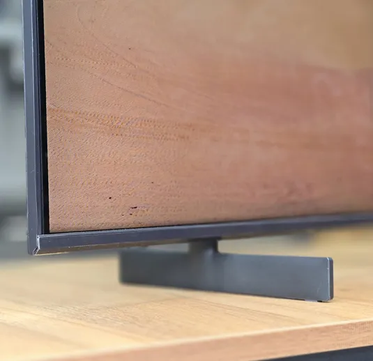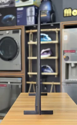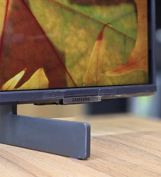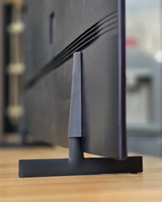 قاب دور صفحه نمایش این تلویزیون بسیار باریکه و به اصطلاح 3 Bezel-less شناخته میشه، یعنی از سه طرف تقریباً بدون حاشیه است. این طراحی به شما کمک میکنه تا تمرکز بیشتری روی محتوای در حال پخش داشته باشید و از تماشای تلویزیون لذت بیشتری ببرید. پایههای تلویزیون خطی و در دو طرف قرار گرفتن، ساخته شده از پلاستیک فشرده و ارتفاعشون قابل تنظیمه. شما میتونید پایهها رو طوری تنظیم کنید که حدود 2.5 سانتیمتر ارتفاع تلویزیون رو از سطح میز بالا بیارید، اینطوری میتونید ساندبار رو زیر تلویزیون قرار بدید بدون اینکه دیدتون رو بگیره.