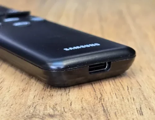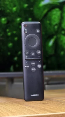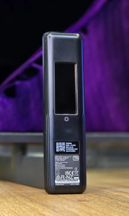 کنترل از راه دور این تلویزیون، مدل TM2360E، با طراحی مشابه پارسال عرضه شده. این ریموت شارژی و بلوتوثی، دارای پنل خورشیدی (SolarCell) در پشت است که با نور محیط شارژ میشود. همچنین، پورت USB-C برای شارژ و میکروفون داخلی برای دستورات صوتی دارد. تلویزیون از دستیارهای صوتی بیکسبی و آمازون الکسا پشتیبانی میکند و میتوان آن را با بلندگوهای هوشمند مانند Google Home یا Amazon Echo کنترل کرد.
