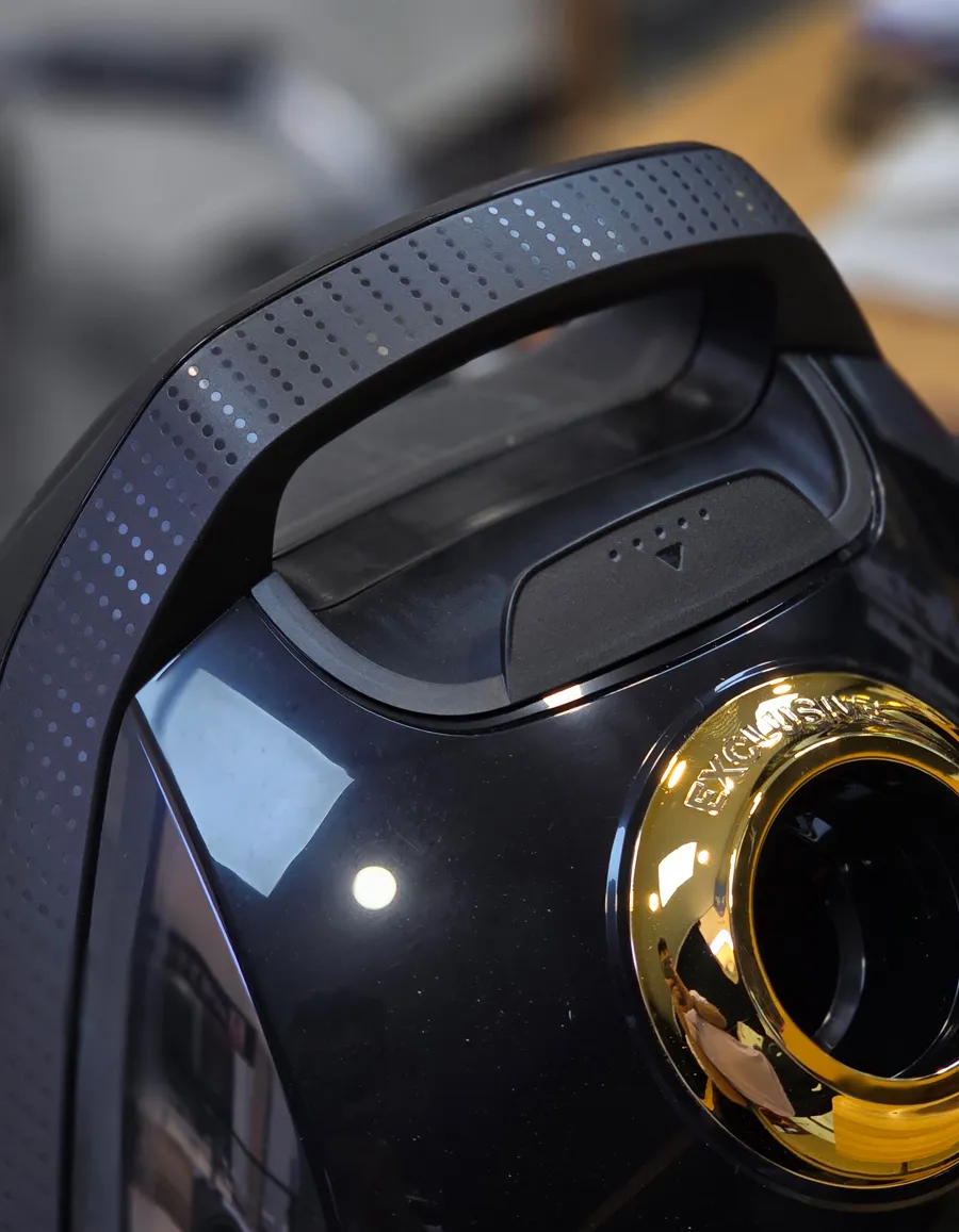 ظاهر این مدل کاملاً با اسمش هماهنگه. رنگ طلایی ملایم با ترکیب مشکی بدنه بهش حس لوکس بودن داده و طراحی کلیش نشون میده با یه محصول سطح بالا طرفی. بدنه از پلاستیک مقاوم ساخته شده که هم سبک و خوش دست باشه هم در برابر خط و خش مقاوم بمونه. دکمه های بزرگ روی بدنه و ولوم تنظیم قدرت مکش وسط دستگاه قرار گرفتن تا موقع کار سریع بهشون دسترسی داشته باشی.