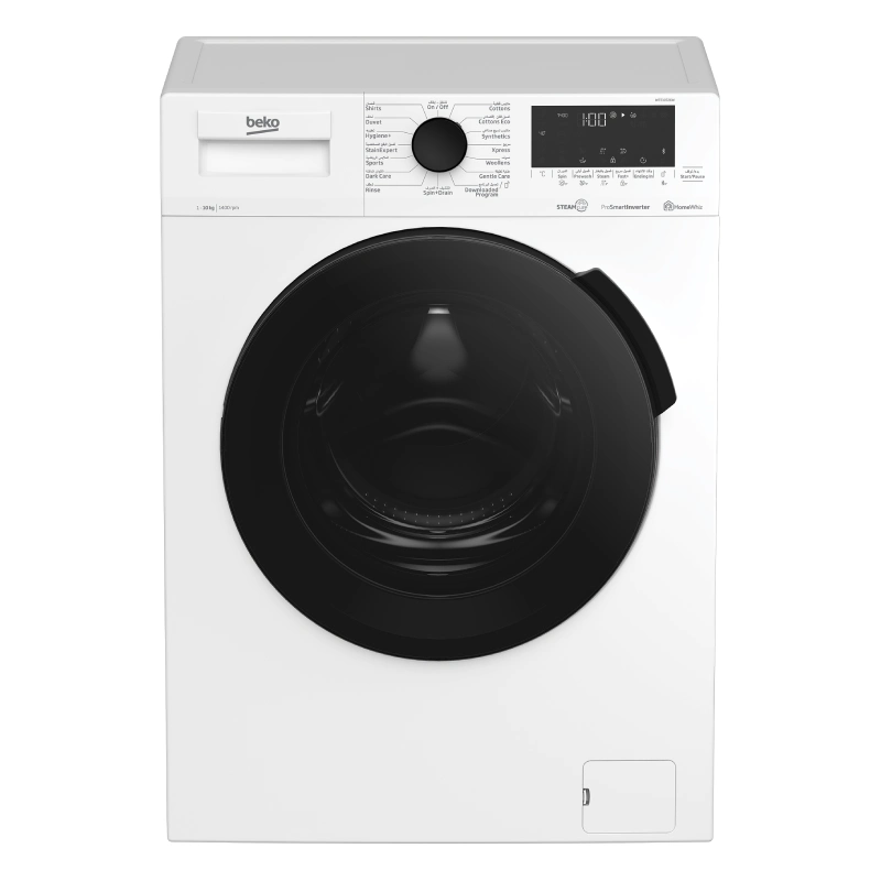 ماشین لباسشویی WTE10726W سفید محصول برند Beko با ظرفیت 10 کیلوگرم در سال 2021 عرضه شده و برای خانواده های متوسط تا پرجمعیت طراحی شده است. این مدل از نوع درب از جلو و روکار بوده، بدنه فلزی با رنگ سفید دارد و مونتاژ آن ترکیه با قطعات ترکیه ای انجام شده است. وزن خالص دستگاه 71 کیلوگرم است و درب مشکی از شیشه حرارت دیده در کنار صفحه نمایش لمسی، ظاهر مدرن و کاربری راحتی را فراهم میکند. وجود قفل کودک، شستشو با تاخیر و قابلیت اضافه کردن مجدد لباس از امکانات کاربردی این مدل محسوب میشود.